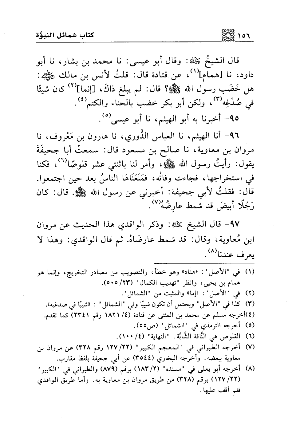 97 - قال الشيخ رحمه الله: وذكر الواقدي هذا الحديث عن مروان بن معاوية، وقال: قد شمط عارضاه. ثم قال الواقدي: وهذا لا يعرف عندنا.