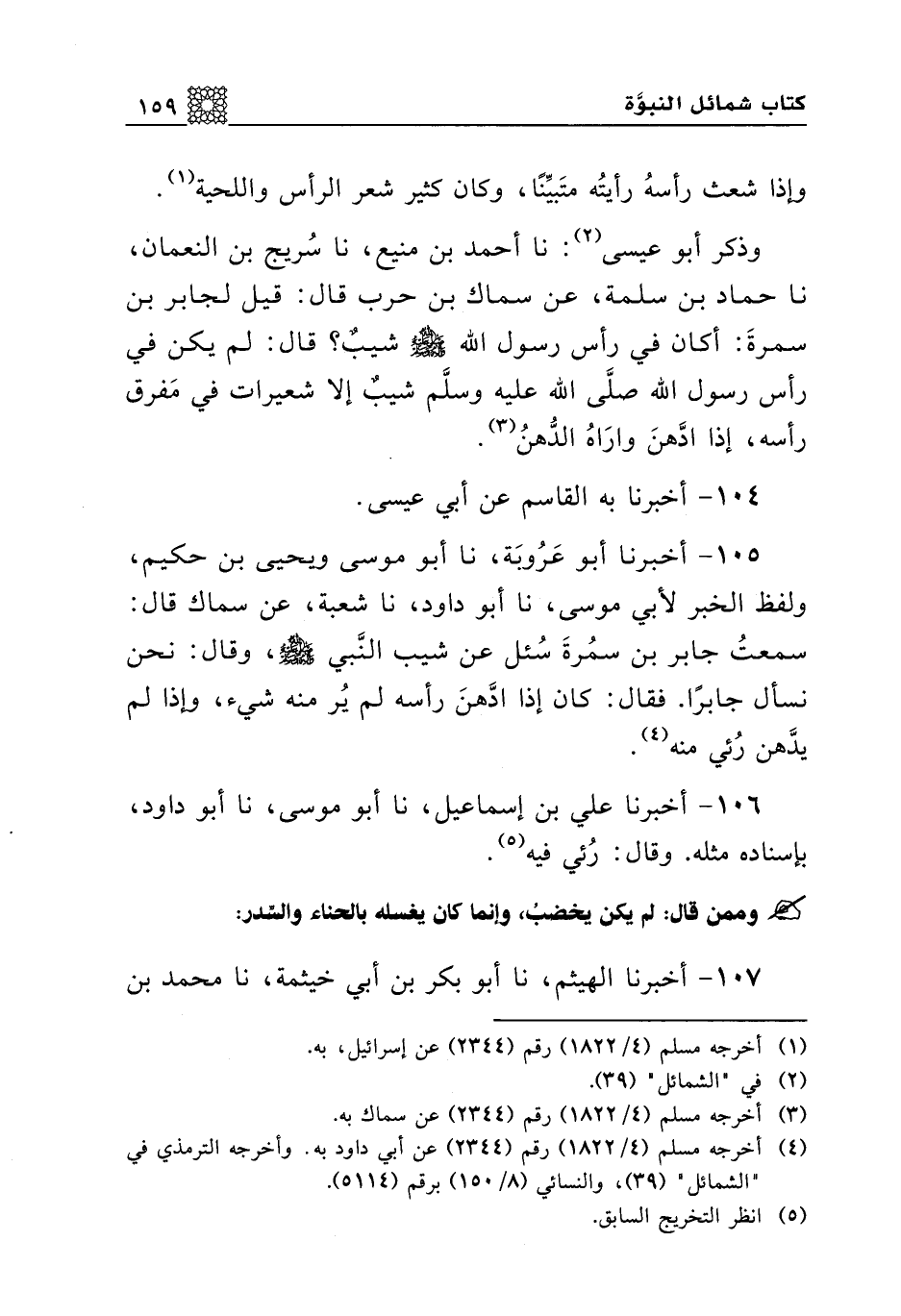 107 - أخبرنا الهيثم، نا أبو بكر بن أبي خيثمة، نا محمد بن عبد الله الرازي، نا محمد بن الزبرقان أبو همام الأهوازي، عن مروان بن سالم، عن عبد الله بن همام، قال: قلت: يا أبا الدرداء، بأي شيء كان رسول الله صلى الله عليه وسلم يخضب؟ قال: يا ابن أخي، أو يا بني، ما بلغ منه الشيب ما كان يخضب، ولكن قد كان منه ها هنا شعرات بيض، فكان يغسله بالحناء والسدر.