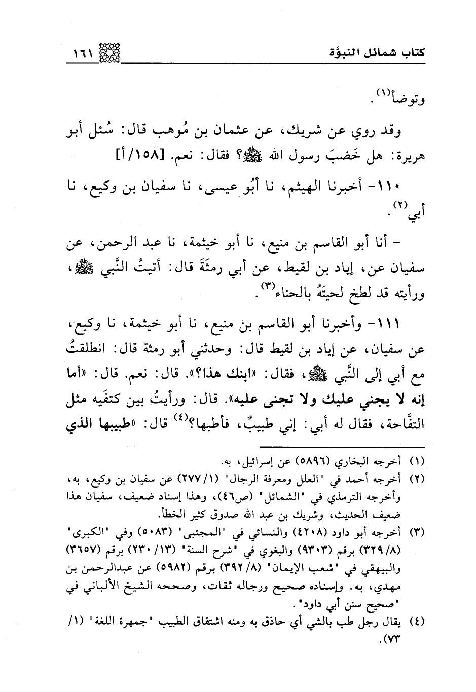 111 - وأخبرنا أبو القاسم بن منيع، نا أبو خيثمة، نا وكيع، عن سفيان، عن إياد بن لقيط قال: وحدثني أبو رمثة قال: انطلقت مع أبي إلى النبي صلى الله عليه وسلم، فقال: "ابنك هذا؟ ". قال: نعم. قال: "أما إنه لا يجني عليك ولا تجني عليه". قال: ورأيت بين كتفيه مثل التفاحة، فقال له أبي: إني طبيب، فأطبها؟ قال: "طبيبها الذي خلقها". قال: ورأيت برأسه ردعا من حناء.
