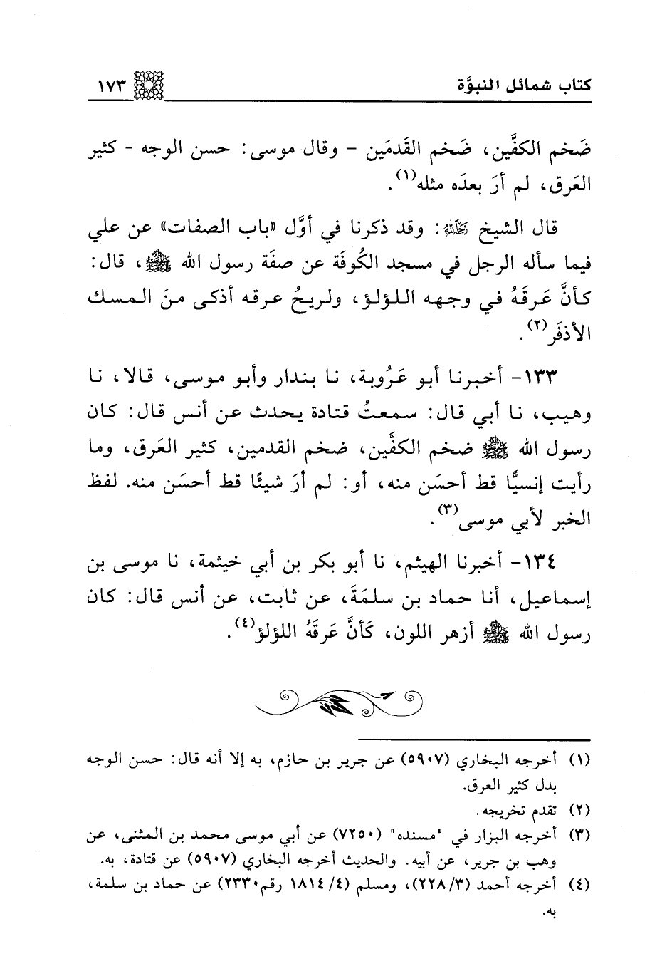 134 - أخبرنا الهيثم، نا أبو بكر بن أبي خيثمة، نا موسى بن إسماعيل، أنا حماد بن سلمة، عن ثابت، عن أنس قال: كان رسول الله صلى الله عليه وسلم أزهر اللون، كأن عرقه اللؤلؤ.