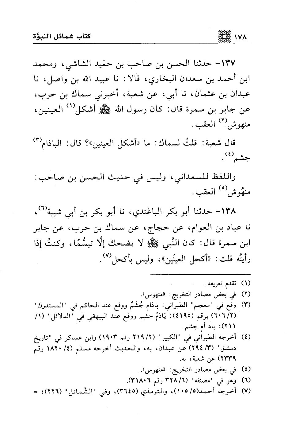 137 - حدثنا الحسن بن صاحب بن حميد الشاشي، ومحمد بن أحمد بن سعدان البخاري، قالا: نا عبيد الله بن واصل، نا عبدان بن عثمان، نا أبي، عن شعبة، أخبرني سماك بن حرب، عن جابر بن سمرة قال: كان رسول الله صلى الله عليه وسلم أشكل العينين، منهوش العقب.