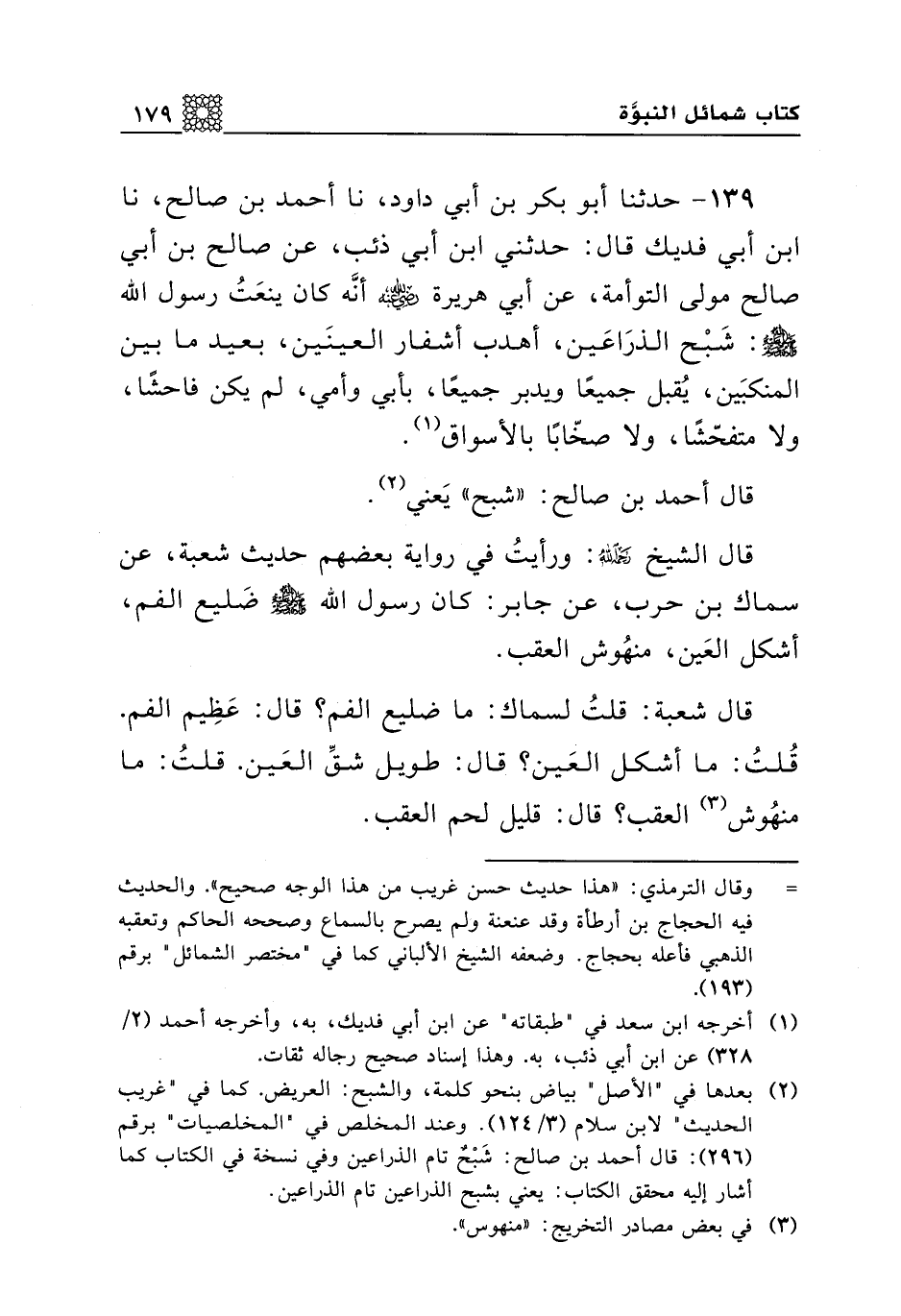 139 - حدثنا أبو بكر بن أبي داود، نا أحمد بن صالح، نا ابن أبي فديك قال: حدثني ابن أبي ذئب، عن صالح بن أبي صالح مولى التوأمة، عن أبي هريرة رضي الله عنه أنه كان ينعت رسول الله صلى الله عليه وسلم: شبح الذراعين، أهدب أشفار العينين، بعيد ما بين المنكبين، يقبل جميعا ويدبر جميعا، بأبي وأمي، لم يكن فاحشا، ولا متفحشا، ولا صخابا بالأسواق.