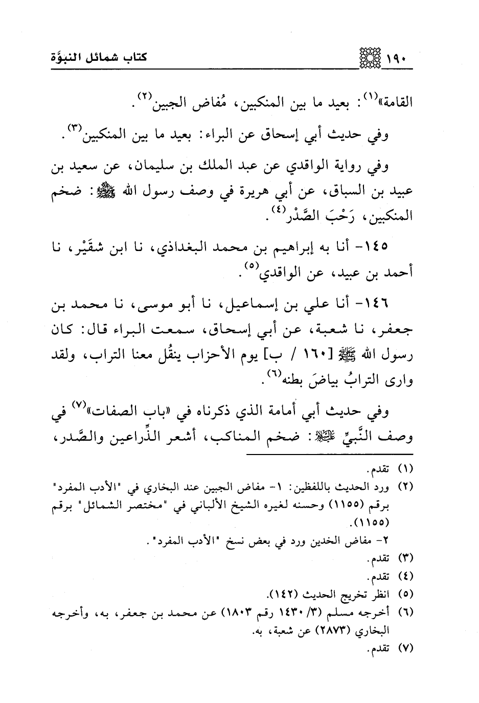 وفي رواية الواقدي عن عبد الملك بن سليمان، عن سعيد بن عبيد بن السباق، عن أبي هريرة في وصف رسول الله صلى الله عليه وسلم: ضخم المنكبين، رحب الصدر.