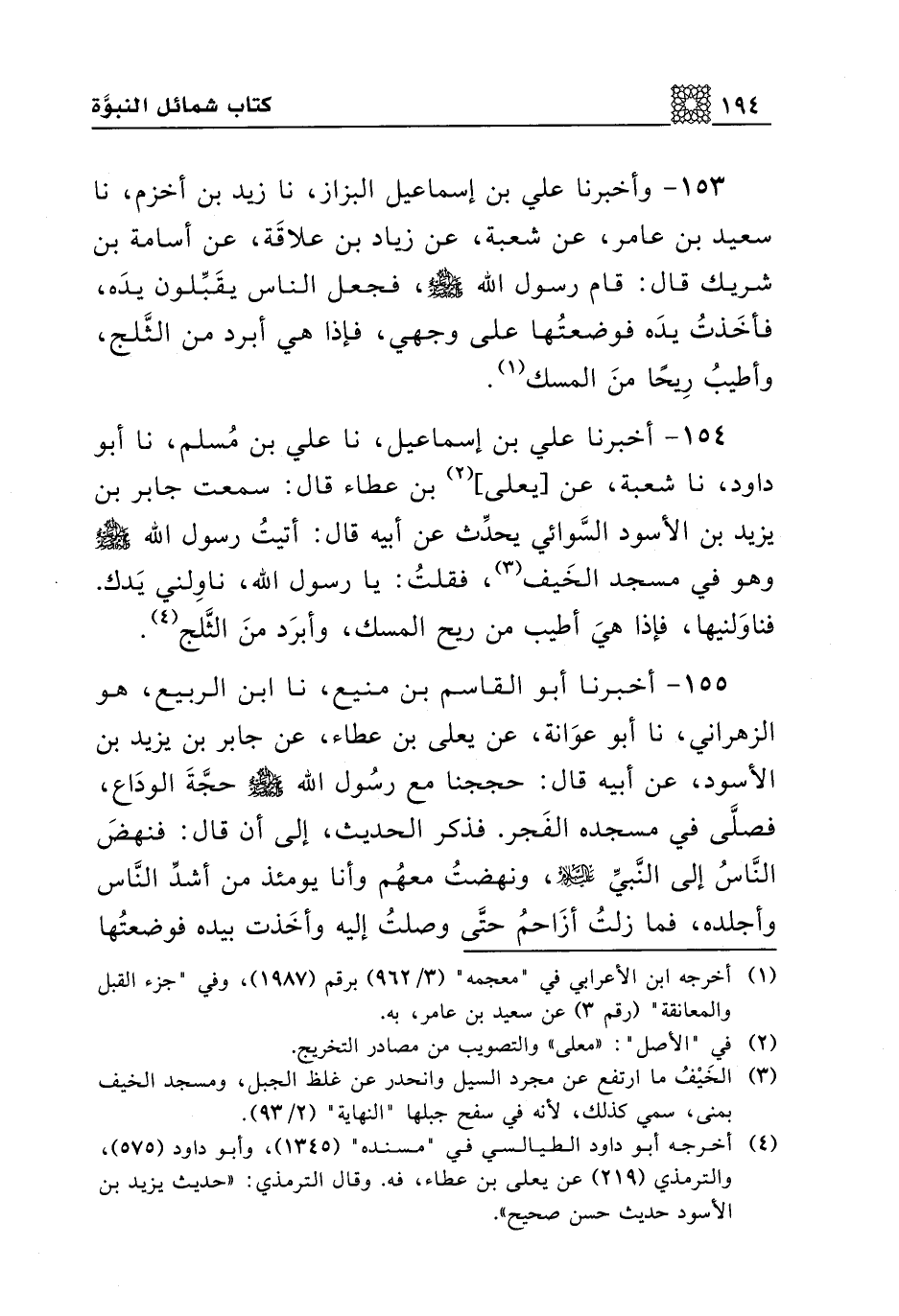 155 - أخبرنا أبو القاسم بن منيع، نا ابن الربيع، هو الزهراني، نا أبو عوانة، عن يعلى بن عطاء، عن جابر بن يزيد بن الأسود، عن أبيه قال: حججنا مع رسول الله صلى الله عليه وسلم حجة الوداع، فصلى في مسجده الفجر. فذكر الحديث، إلى أن قال: فنهض الناس إلى النبي عليه السلام، ونهضت معهم وأنا يومئذ من أشد الناس وأجلده، فما زلت أزاحم حتى وصلت إليه وأخذت بيده فوضعتها إما على صدري، وإما على وجهي، فما وجدت شيئا أبرد وأطيب من يد رسول الله صلى الله عليه وسلم.