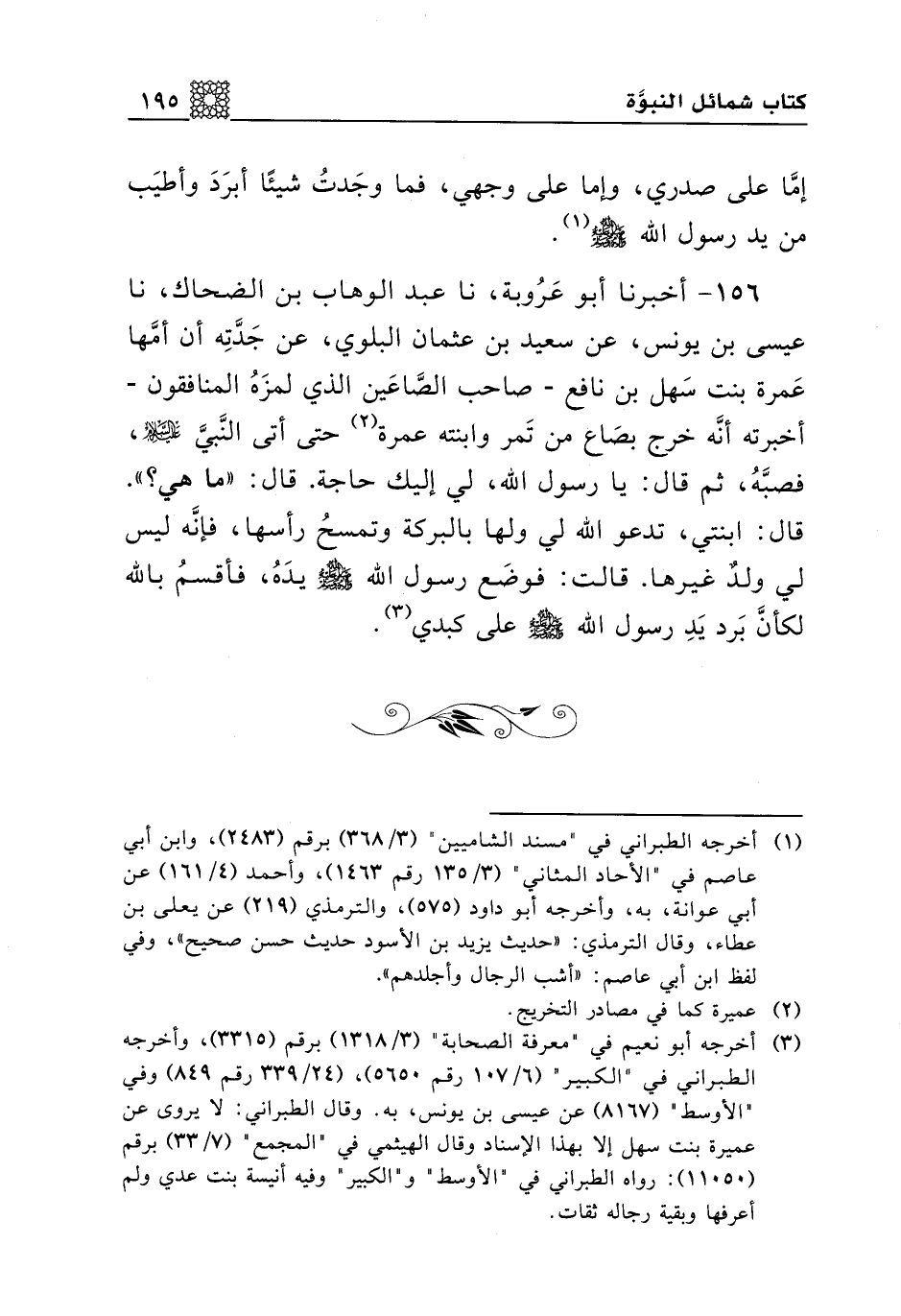 156 - أخبرنا أبو عروبة، نا عبد الوهاب بن الضحاك، نا عيسى بن يونس، عن سعيد بن عثمان البلوي، عن جدته أن أمها عمرة بنت سهل بن نافع -صاحب الصاعين الذي لمزه المنافقون- أخبرته أنه خرج بصاع من تمر وابنته عمرة حتى أتى النبي عليه السلام، فصبه، ثم قال: يا رسول الله، لي إليك حاجه. قال: "ما هي؟ ". قال: ابنتي، تدعو الله لي ولها بالبركة وتمسح رأسها، فإنه ليس لي ولد غيرها. قالت: فوضع رسول الله صلى الله عليه وسلم يده، فأقسم بالله لكأن برد يد رسول الله صلى الله عليه وسلم على كبدي.