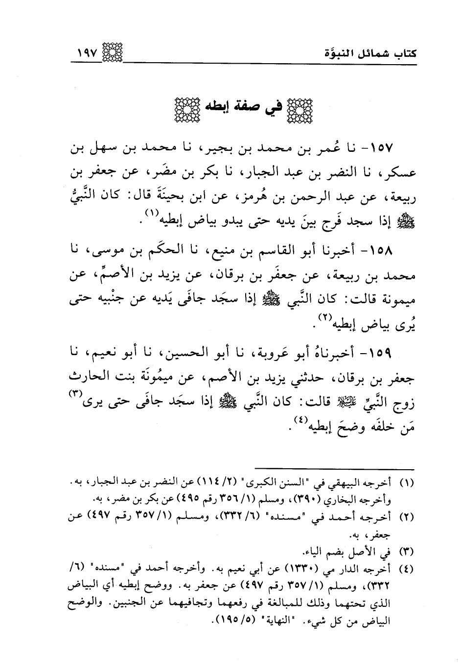 157 - نا عمر بن محمد بن بجير، نا محمد بن سهل بن عسكر، نا النضر بن عبد الجبار، نا بكر بن مضر، عن جعفر بن ربيعة، عن عبد الرحمن بن هرمز، عن ابن بحينة قال: كان النبي صلى الله عليه وسلم إذا سجد فرج بين يديه حتى يبدو بياض إبطيه.