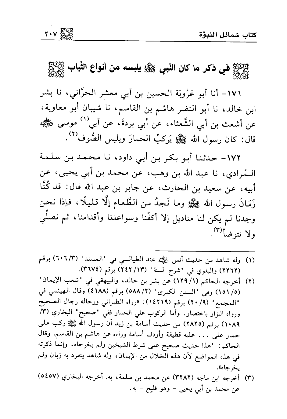 171 - أنا أبو عروبة الحسين بن أبي معشر الحراني، نا بشر بن خالد، نا أبو النضر هاشم بن القاسم، نا شيبان أبو معاوية، عن أشعث بن أبي الشعثاء، عن أبي بردة، عن أبي موسى رضي الله عنه قال: كان رسول الله صلى الله عليه وسلم يركب الحمار ويلبس الصوف.