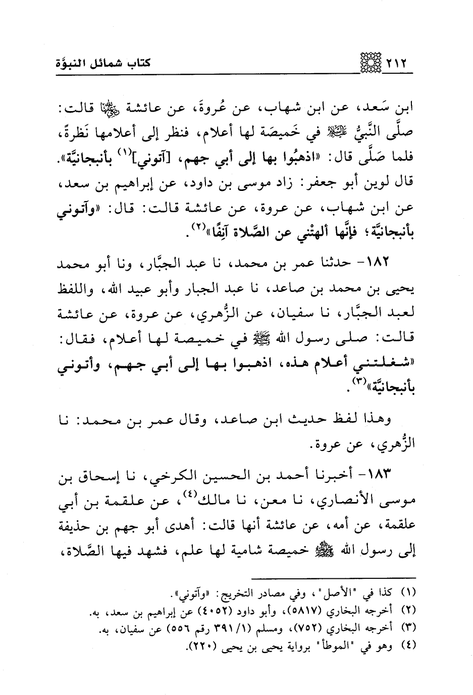 182 - حدثنا عمر بن محمد، نا عبد الجبار، ونا أبو محمد يحيى بن محمد بن صاعد، نا عبد الجبار وأبو عبيد الله، واللفظ لعبد الجبار، نا سفيان، عن الزهري، عن عروة، عن عائشة قالت: صلى رسول الله صلى الله عليه وسلم في خميصة لها أعلام، فقال: "شغلتني أعلام هذه، اذهبوا بها إلى أبي جهم، وأتوني بأنبجانية".