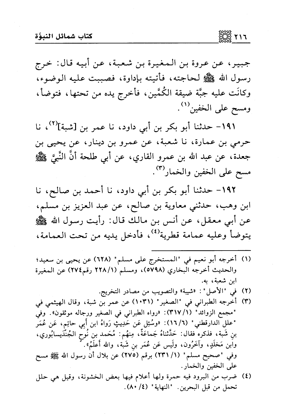 191 - حدثنا أبو بكر بن أبي داود، نا عمر بن [شبة]، نا حرمي بن عمارة، نا شعبة، عن عمرو بن دينار، عن يحيى بن جعدة، عن عبد الله بن عمرو القاري، عن أبي طلحة أن النبي صلى الله عليه وسلم مسح على الخفين والخمار.