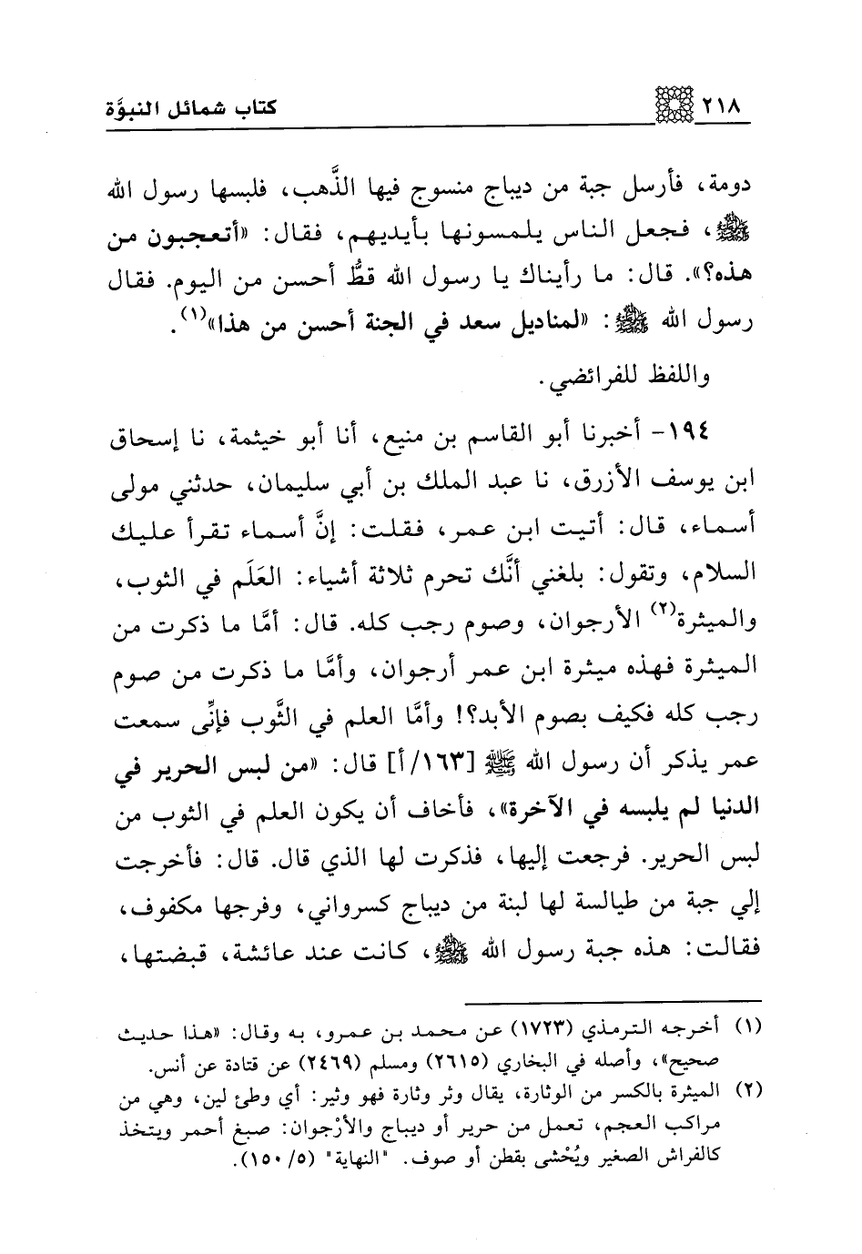 194 - أخبرنا أبو القاسم بن منيع، أنا أبو خيثمة، نا إسحاق بن يوسف الأزرق، نا عبد الملك بن أبي سليمان، حدثني مولى أسماء، قال: أتيت ابن عمر، فقلت: إن أسماء تقرأ عليك السلام، وتقول: بلغني أنك تحرم ثلاثة أشياء: العلم في الثوب، والميثرة الأرجوان، وصوم رجب كله. قال: أما ما ذكرت من الميثرة فهذه ميثرة ابن عمر أرجوان، وأما ما ذكرت من صوم رجب كله فكيف بصوم الأبد؟ ّ! وأما العلم في الثوب فإني سمعت عمر يذكر أن رسول الله صلى الله عليه وسلم قال: "من لبس الحرير في الدنيا لم يلبسه في الآخرة"، فأخاف أن يكون العلم في الثوب من لبس الحرير. فرجعت إليها، فذكرت لها الذي قال. قال: فأخرجت إلي جبة من طيالسه لها لبنة من ديباج كسرواني، وفرجها مكفوف، فقالت: هذه جبة رسول الله صلى الله عليه وسلم، كانت عند عائشة، قبضتها، نحن نغسلها للمريض إذا اشتكى.