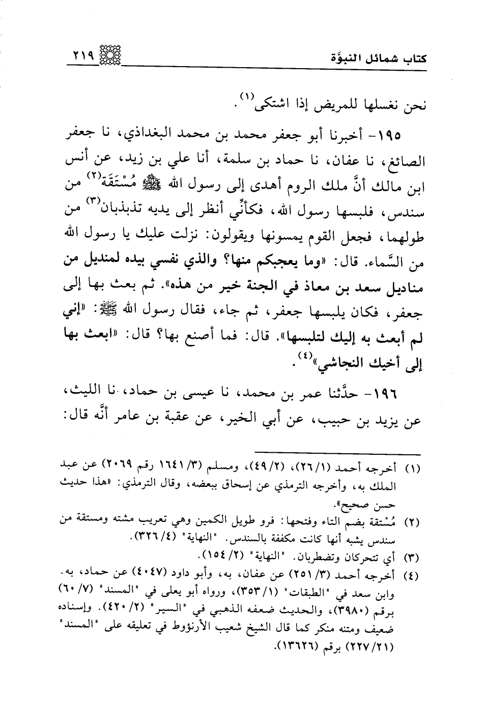 195 - أخبرنا أبو جعفر محمد بن محمد البغداذي، نا جعفر الصائغ، نا عفان، نا حماد بن سلمة، أنا علي بن زيد، عن أنس بن مالك أن ملك الروم أهدى إلى رسول الله صلى الله عليه وسلم مستقة من سندس، فلبسها رسول الله، فكأني أنظر إلى يديه تذبذبان من طولهما، فجعل القوم يمسونها ويقولون: نزلت عليك يا رسول الله من السماء. قال: "وما يعجبكم منها؟ والذي نفسي بيده لمنديل من مناديل سعد بن معاذ في الجنة خير من هذه". ثم بعث بها إلى جعفر، فكان يلبسها جعفر، ثم جاء، فقال رسول الله صلى الله عليه وسلم: "إني لم أبعث به إليك لتلبسها". قال: فما أصنع بها؟ قال: "ابعث بها إلى أخيك النجاشي".