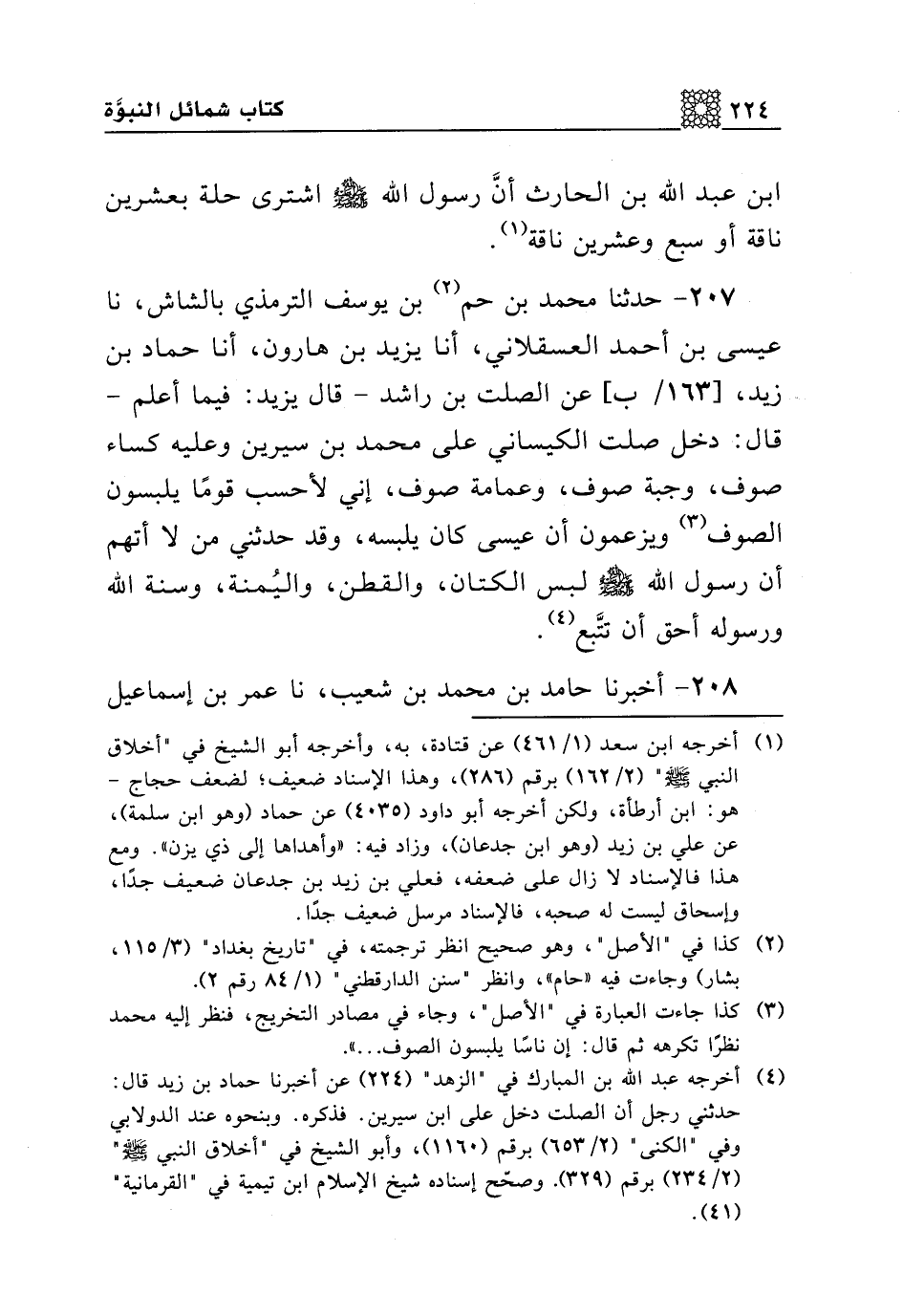 207 - حدثنا محمد بن حم (1) بن يوسف الترمذي بالشاش، نا عيسى بن أحمد العسقلاني، أنا يزيد بن هارون، أنا حماد بن زيد، عن الصلت بن راشد - قال يزيد: فيما أعلم- قال: دخل صلت الكيساني على محمد بن سيرين وعليه كساء صوف، وجبة صوف، وعمامة صوف، إني لأحسب قوما يلبسون الصوف ويزعمون أن عيسى كان يلبسه، وقد حدثني من لا أتهم أن رسول الله صلى الله عليه وسلم لبس الكتان، والقطن، واليمنة، وسنة الله ورسوله أحق أن تتبع.