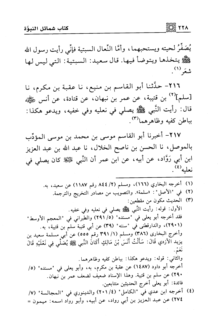 217 - أخبرنا أبو القاسم موسى بن محمد بن موسى المؤدب بالموصل، نا الحسن بن ناصح الخلال، نا عبد الله بن عبد العزيز بن أبي رواد، عن أبيه، عن ابن عمر أن النبي عليه السلام كان يصلي في نعليه.