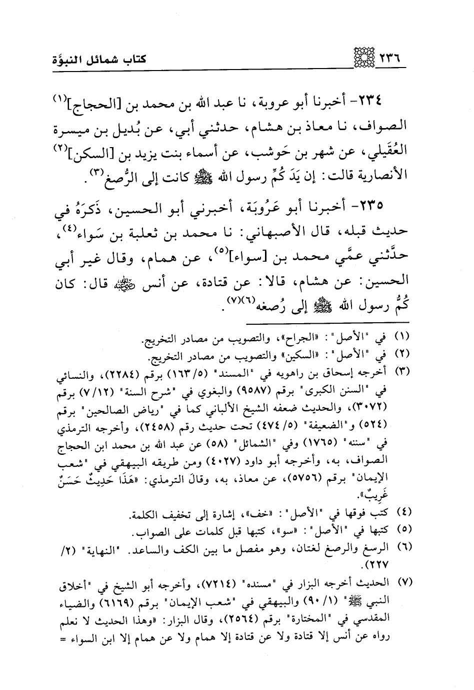 234 - أخبرنا أبو عروبة، نا عبد الله بن محمد بن [الحجاج] الصواف، نا معاذ بن هشام، حدثني أبي، عن بديل بن ميسرة العقيلي، عن شهر بن حوشب، عن أسماء بنت يزيد بن [السكن] الأنصارية قالت: إن يد كم رسول الله صلى الله عليه وسلم كانت إلى الرصغ.