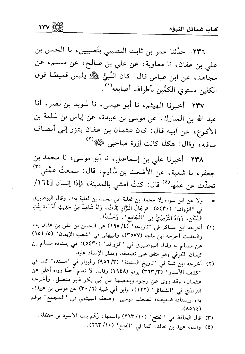 237 - أخبرنا الهيثم، نا أبو عيسى، نا سويد بن نصر، أنا عبد الله بن المبارك، عن موسى بن عبيدة، عن إياس بن سلمة بن الأكوع، عن أبيه قال: كان عثمان بن عفان يتزر إلى أنصاف ساقيه، وقال: هكذا كانت إزرة صاحبي عليه السلام.