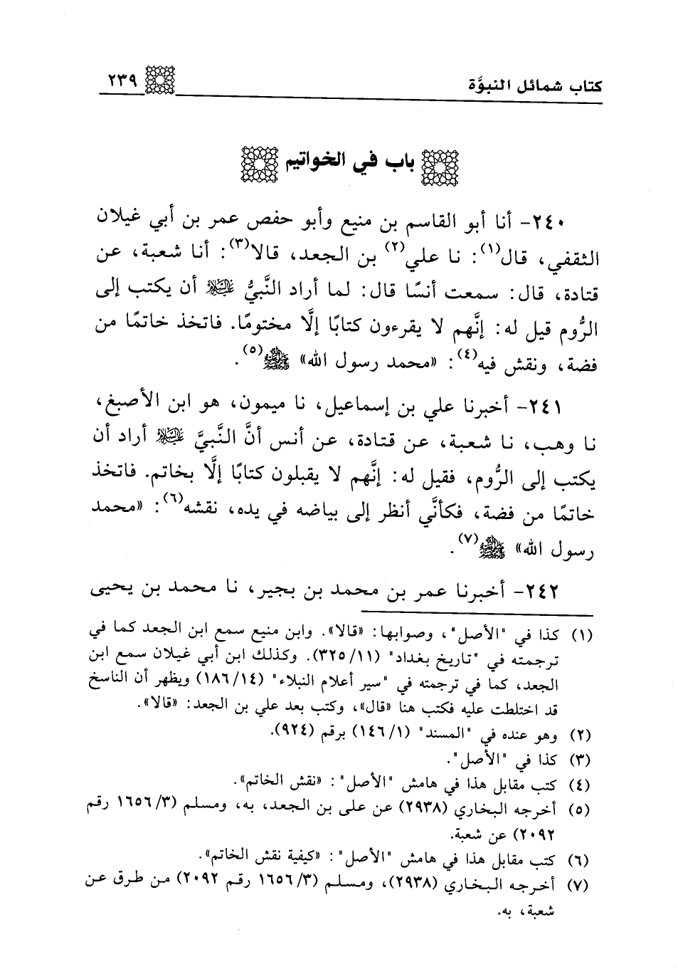 240 - أنا أبو القاسم بن منيع وأبو حفص عمر بن أبي غيلان الثقفي، قال: نا علي بن الجعد، قالا: أنا شعبة، عن قتادة، قال: سمعت أنسا قال: لما أراد النبي عليه السلام أن يكتب إلى الروم قيل له: إنهم لا يقرءون كتابا إلا مختوما. فاتخذ خاتما من فضة، ونفش فيه: "محمد رسول الله" صلى الله عليه وسلم.