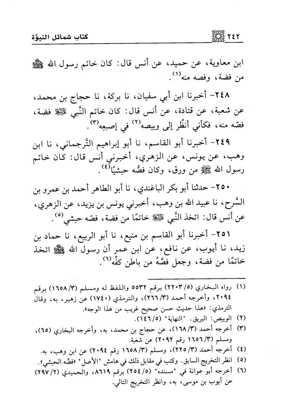 250 - حدثنا أبو بكر الباغندي، نا أبو الطاهر أحمد بن عمرو بن السرح، نا عبيد الله بن وهب، أخبرني يونس بن يزيد، عن الزهري، عن أنس قال: اتخذ النبي عليه السلام خاتما من فضة، فصه حبشي.