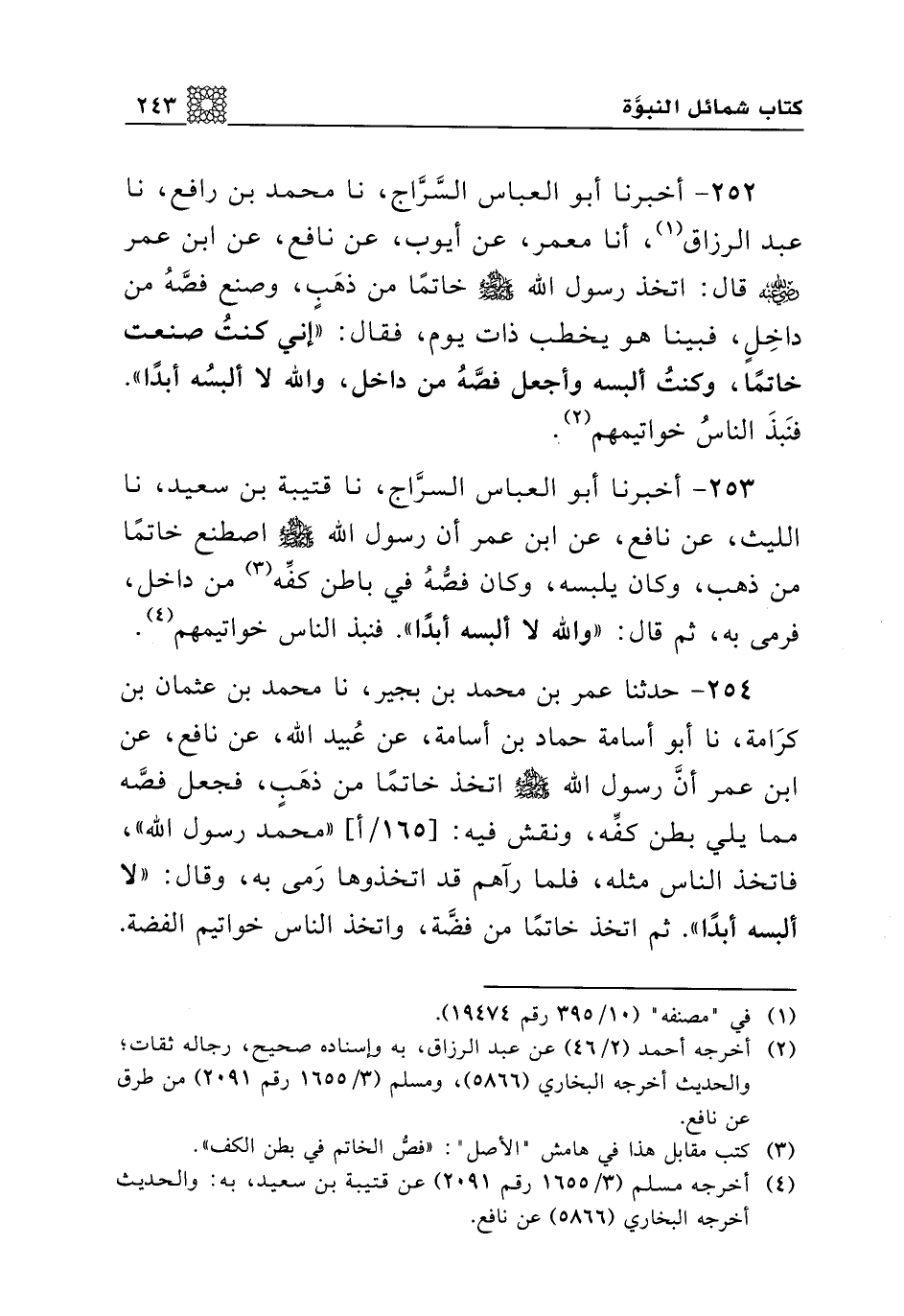 253 - أخبرنا أبو العباس السراج، نا قتيبة بن سعيد، نا الليث، عن نافع، عن ابن عمر أن رسول الله صلى الله عليه وسلم اصطنع خاتما من ذهب، وكان يلبسه، وكان فصه في باطن كفه من داخل، فرمى به، ثم قال: "والله لا ألبسه أبدا". فنبذ الناس خواتيمهم.
