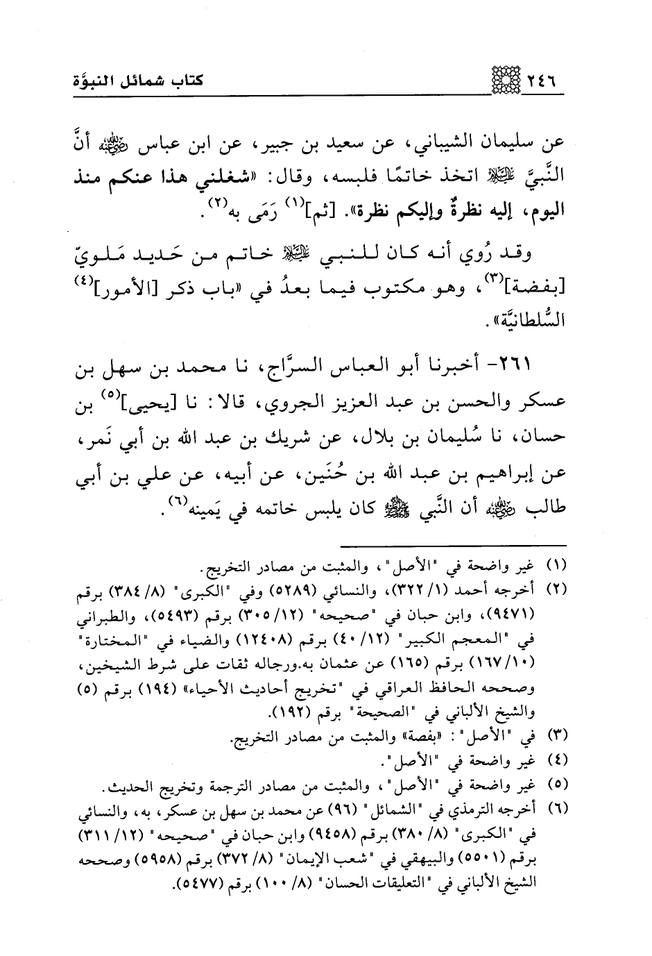 261 - أخبرنا أبو العباس السراج، نا محمد بن سهل بن عسكر والحسن بن عبد العزيز الجروي، قالا: نا [يحيى] بن حسان، نا سليمان بن بلال، عن شريك بن عبد الله بن أبي نمر، عن إبراهيم بن عبد الله بن حنين، عن أبيه، عن علي بن أبي طالب رضي الله عنه أن النبي صلى الله عليه وسلم كان يلبس خاتمه في يمينه.