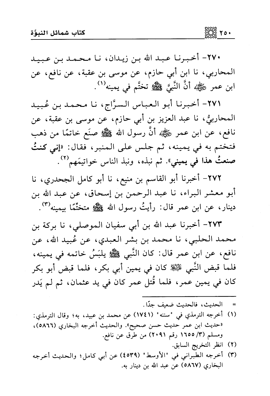 270 - أخبرنا عبد الله بن زيدان، نا محمد بن عبيد المحاربي، نا ابن أبي حازم، عن موسى بن عقبة، عن نافع، عن ابن عمر رضي الله عنه أن النبي صلى الله عليه وسلم تختم في يمينه.