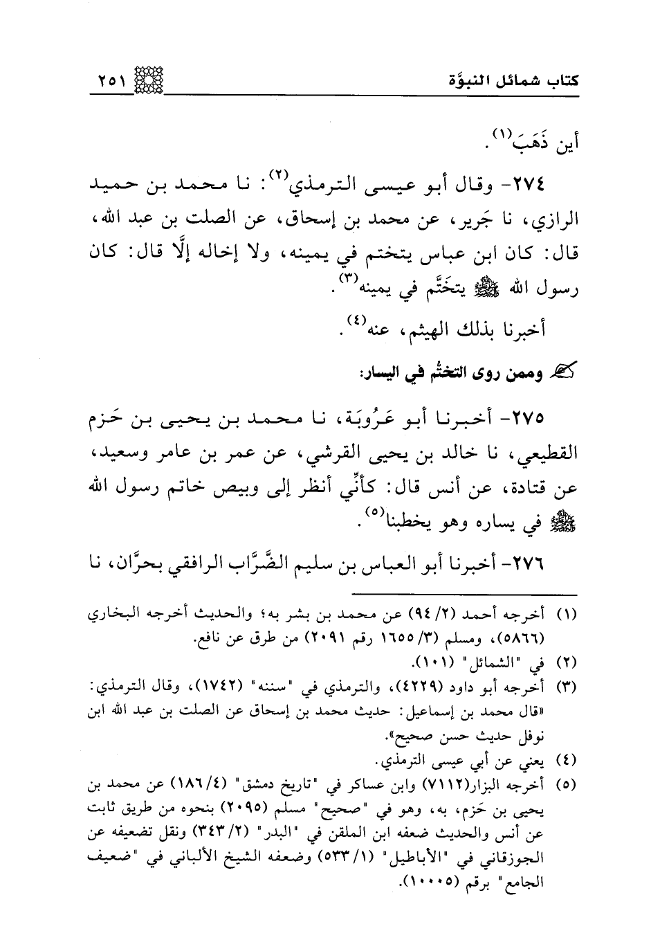 274 - وقال أبو عيسى الترمذي: نا محمد بن حميد الرازي، نا جرير، عن محمد بن إسحاق، عن الصلت بن عبد الله، قال: كان ابن عباس يتختم في يمينه، ولا إخاله إلا قال: كان رسول الله صلى الله عليه وسلم يتختم في يمينه.