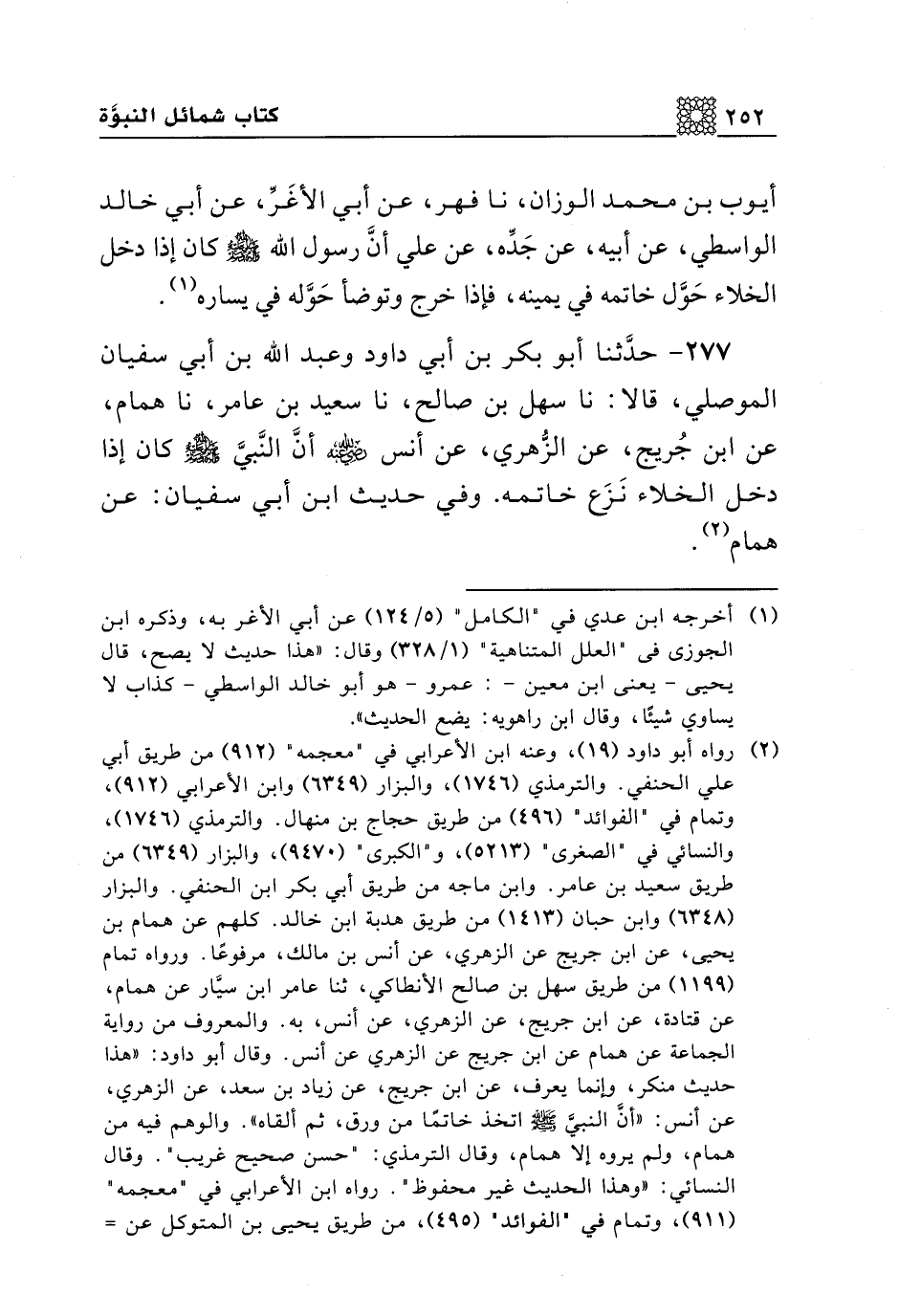 277 - حدثنا أبو بكر بن أبي داود وعبد الله بن أبي سفيان الموصلي، قالا: نا سهل بن صالح، نا سعيد بن عامر، نا همام، عن ابن جريج، عن الزهري، عن أنس رضي الله عنه أن النبي صلى الله عليه وسلم كان إذا دخل الخلاء نزع خاتمه. وفي حديث ابن أبي سفيان: عن همام.