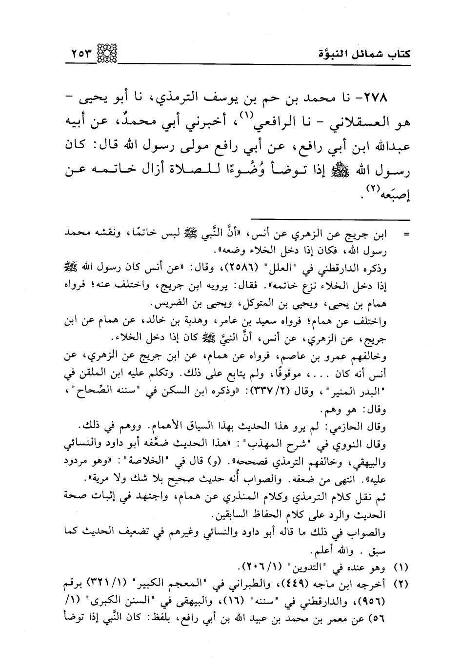 278 - نا محمد بن حم بن يوسف الترمذي، نا أبو يحيى -هو العسقلاني- نا الرافعي، أخبرني أبي محمد، عن أبيه عبد الله بن أبي رافع، عن أبي رافع مولى رسول الله قال: كان رسول الله صلى الله عليه وسلم إذا توضأ وضوءا للصلاة أزال خاتمه عن إصبعه.