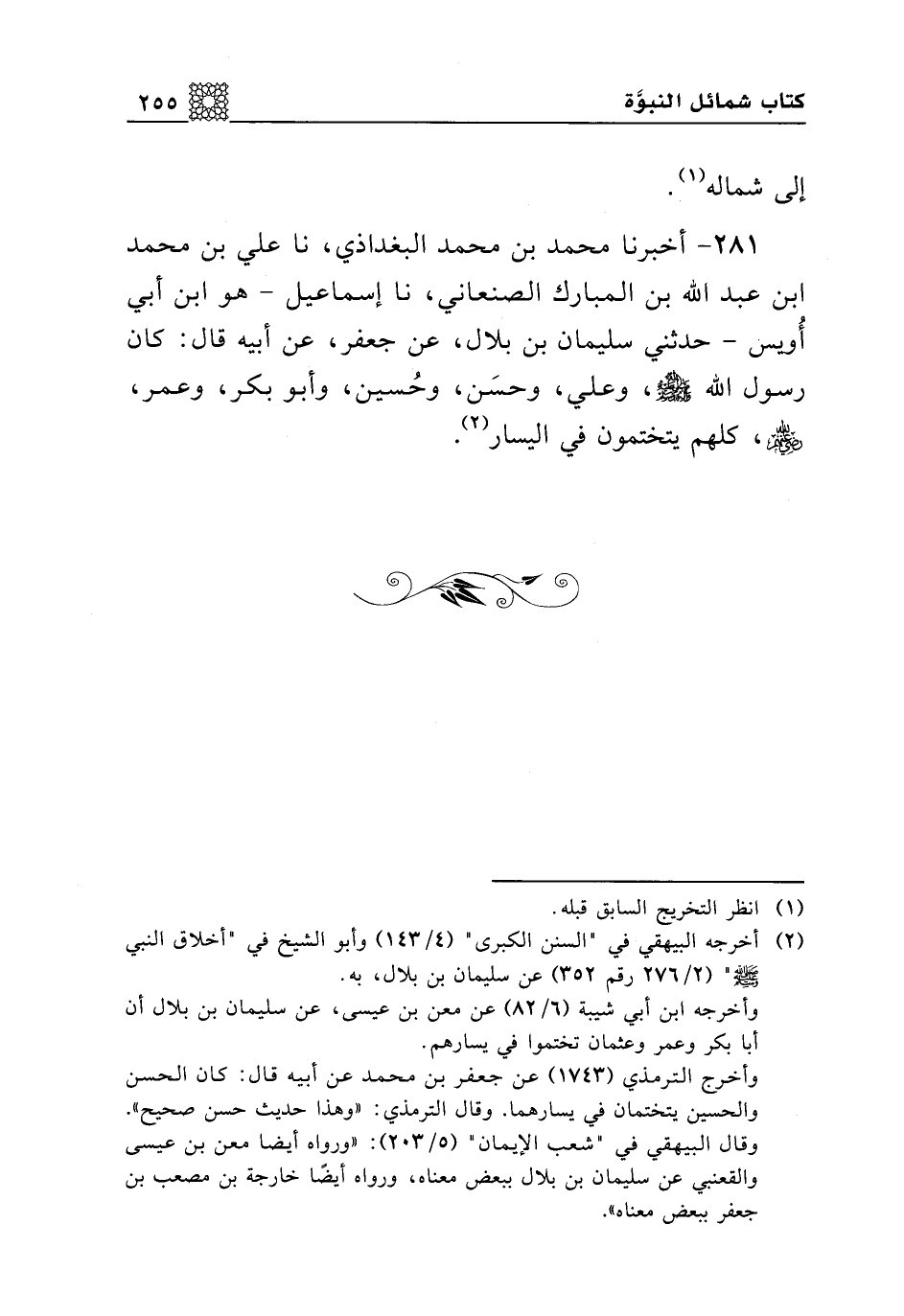 281 - أخبرنا محمد بن محمد البغداذي، نا علي بن محمد بن عبد الله بن المبارك الصنعاني، نا إسماعيل -هو ابن أبي أويس- حدثني سليمان بن بلال، عن جعفر، عن أبيه قال: كان رسول الله صلى الله عليه وسلم، وعلي، وحسن، وحسين، وأبو بكر، وعمر، رضي الله عنهم، كلهم يتختمون في اليسار.