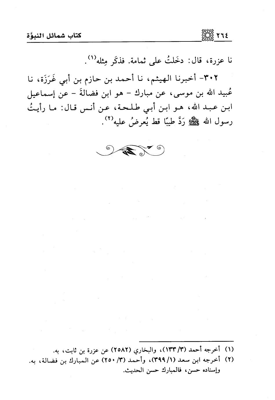 302 - أخبرنا الهيثم، نا أحمد بن حازم بن أبي غرزة، نا عبيد الله بن موسى، عن مبارك -هو ابن فضالة- عن إسماعيل بن عبد الله، هو ابن أبي طلحة، عن أنس قال: ما رأيت رسول الله صلى الله عليه وسلم رد طيبا قط يعرض عليه.