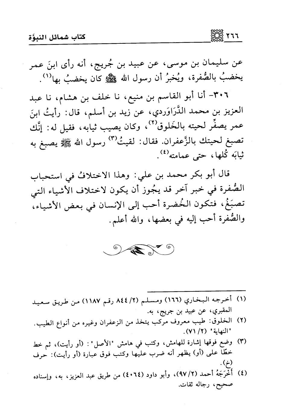 306 - أنا أبو القاسم بن منيع، نا خلف بن هشام، نا عبد العزيز بن محمد الدراوردي، عن زيد بن أسلم، قال: رأيت ابن عمر يصفر لحيته بالخلوق، وكان يصيب ثيابه، فقيل له: إنك تصبغ لحيتك بالزعفران. فقال: لقيت رسول الله صلى الله عليه وسلم يصبغ به ثيابه كلها، حتى عمامته.