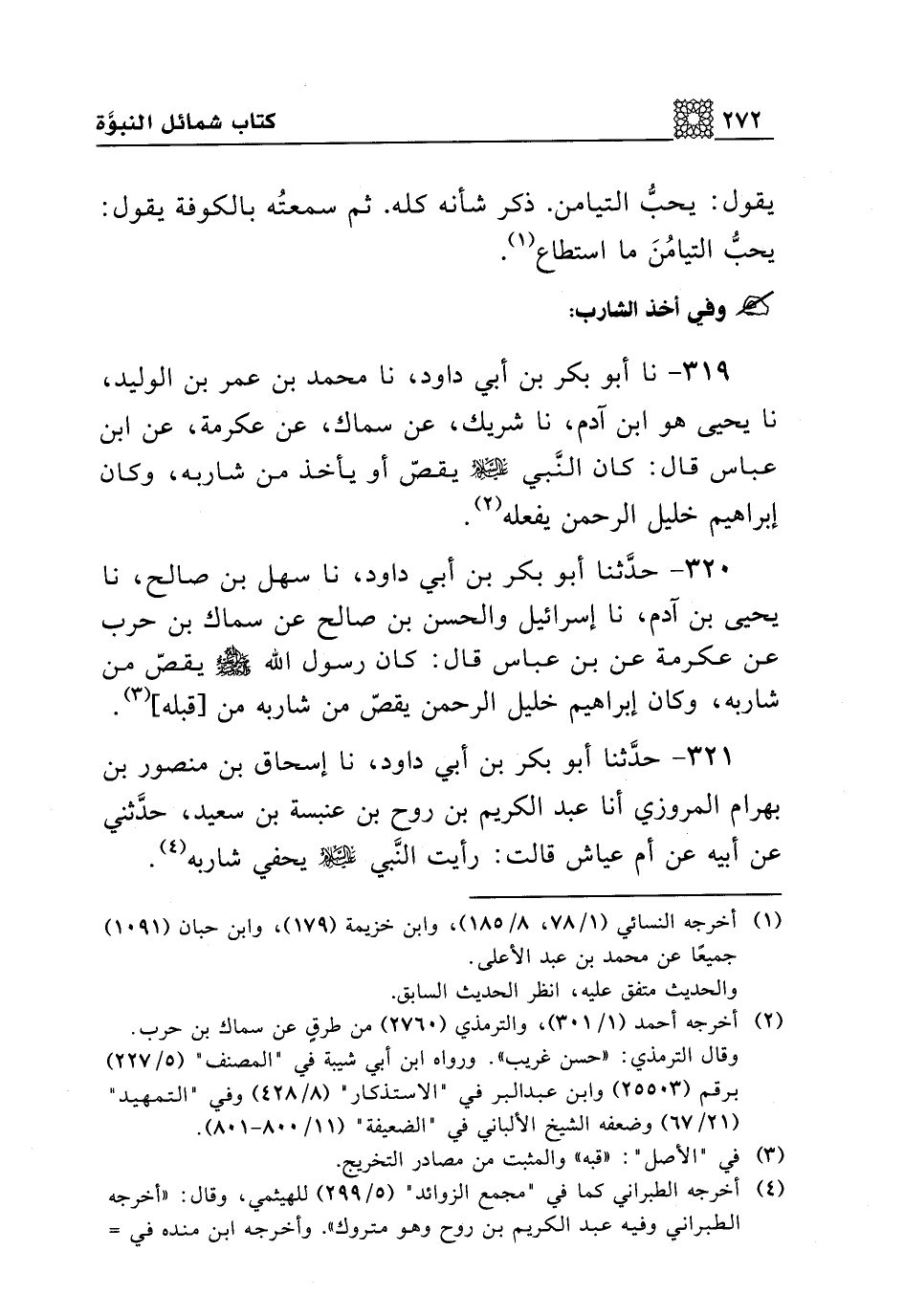 319 - نا أبو بكر بن أبي داود، نا محمد بن عمر بن الوليد، نا يحيى هو ابن آدم، نا شريك، عن سماك، عن عكرمة، عن ابن عباس قال: كان النبي عليه السلام يقص أو يأخذ من شاربه، وكان إبراهيم خليل الرحمن يفعله.