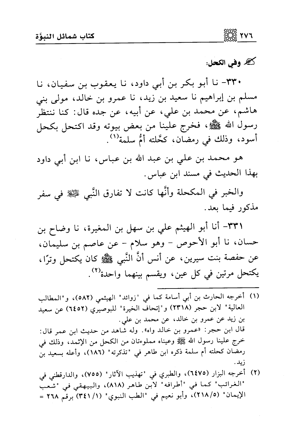 330 - نا أبو بكر بن أبي داود، نا يعقوب بن سفيان، نا مسلم بن إبراهيم نا سعيد بن زيد، نا عمرو بن خالد، مولى بني هاشم، عن محمد بن علي، عن أبيه، عن جده قال: كنا ننتظر رسول الله صلى الله عليه وسلم، فخرج علينا من بعض بيوته وقد اكتحل بكحل أسود، وذلك في رمضان، كحلته أم سلمة.