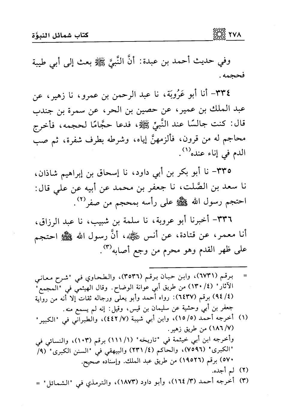 336 - أخبرنا أبو عروبة، نا سلمة بن شبيب، نا عبد الرزاق، أنا معمر، عن قتادة، عن أنس رضي الله عنه، أن رسول الله صلى الله عليه وسلم احتجم على ظهر القدم وهو محرم من وجع أصابه.