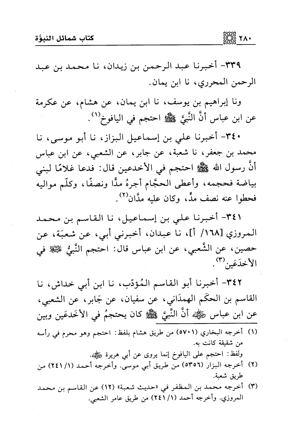 341 - أخبرنا علي بن إسماعيل، نا القاسم بن محمد المروزي، نا عبدان، أخبرني أبي، عن شعبة، عن حصين، عن الشعبي، عن ابن عباس قال: احتجم النبي عليه السلام في الأخدعين.