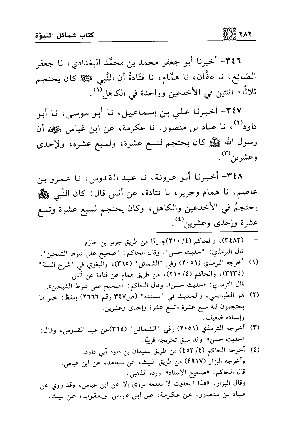 346 - أخبرنا أبو جعفر محمد بن محمد البغداذي، نا جعفر الصائغ، نا عفان، نا همام، نا قتادة أن النبي عليه السلام كان يحتجم ثلاثا، اثنتين في الأخدعين وواحدة في الكاهل.