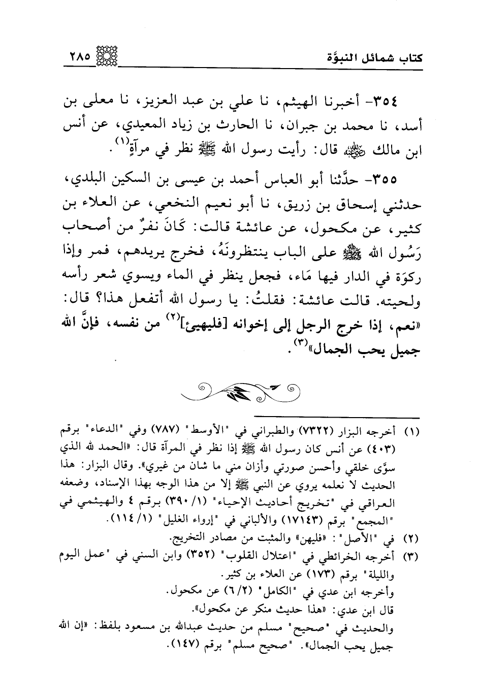 355 - حدثنا أبو العباس أحمد بن عيسى بن السكين البلدي، حدثني إسحاق بن زريق، نا أبو نعيم النخعي، عن العلاء بن كثير، عن مكحول، عن عائشة قالت: كان نفر من أصحاب رسول الله صلى الله عليه وسلم على الباب ينتظرونه، فخرج يريدهم، فمر وإذا ركوة في الدار فيها ماء، فجعل ينظر في الماء ويسوي شعر رأسه ولحيته. قالت عائشة: فقلت: يا رسول الله أتفعل هذا؟ قال: "نعم، إذا خرج الرجل إلى إخوانه [فليهيىء] من نفسه، فإن الله جميل يحب الجمال".