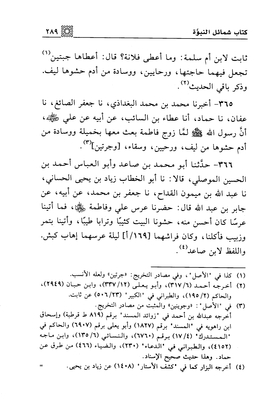 365 - أخبرنا محمد بن محمد البغداذي، نا جعفر الصائغ، نا عفان، نا حماد، أنا عطاء بن السائب، عن أبيه عن علي رضي الله عنه، أن رسول الله صلى الله عليه وسلم لما زوج فاطمة بعث معها بخميلة ووسادة من أدم حشوها من ليف، ورحيين، وسقاء، [وجرتين].