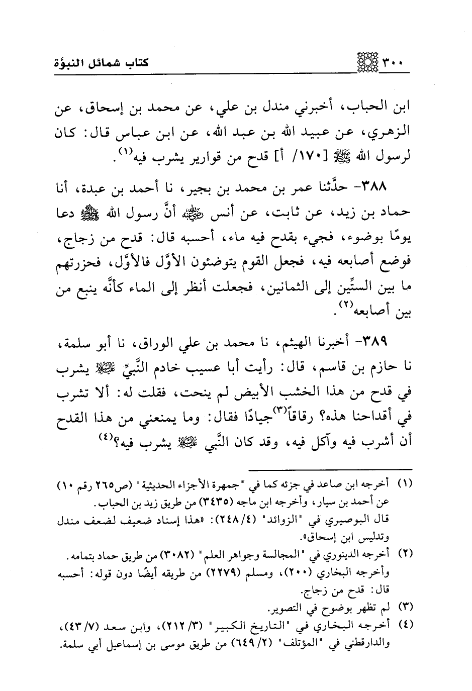 389 - أخبرنا الهيثم، نا محمد بن علي الوراق، نا أبو سلمة، نا حازم بن قاسم، قال: رأيت أبا عسيب خادم النبي عليه السلام يشرب في قدح من هذا الخشب الأبيض لم ينحت، فقلت له: ألا تشرب في أقداحنا هذه؟ رقاقا جيادا فقال: وما يمنعني من هذا القدح أن أشرب فيه وآكل فيه، وقد كان النبي عليه السلام يشرب فيه؟