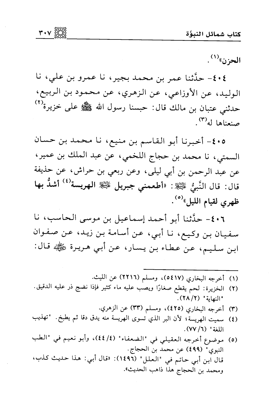 405 - أخبرنا أبو القاسم بن منيع، نا محمد بن حسان السمتي، نا محمد بن حجاج اللخمي، عن عبد الملك بن عمير، عن عبد الرحمن بن أبي ليلى، وعن ربعي بن حراش، عن حذيفة قال: قال النبي عليه السلام: "أطعمني جبريل عليه السلام الهريسة أشد بها ظهري لقيام الليل".