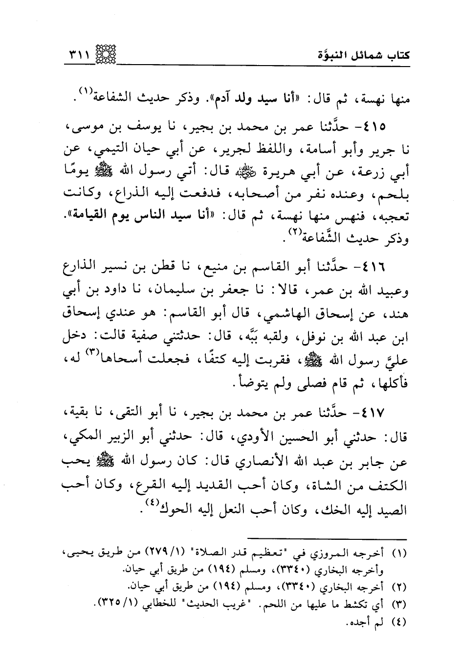 415 - حدثنا عمر بن محمد بن بجير، نا يوسف بن موسى، نا جرير وأبو أسامة، واللفظ لجرير، عن أبي حيان التيمي، عن أبي زرعة، عن أبي هريرة رضي الله عنه قال: أتي رسول الله صلى الله عليه وسلم يوما بلحم، وعنده نفر من أصحابه، فدفعت إليه الذراع، وكانت تعجبه، فنهس منها نهسة، ثم قال: " أنا سيد الناس يوم القيامة". وذكر حديث الشفاعة.
