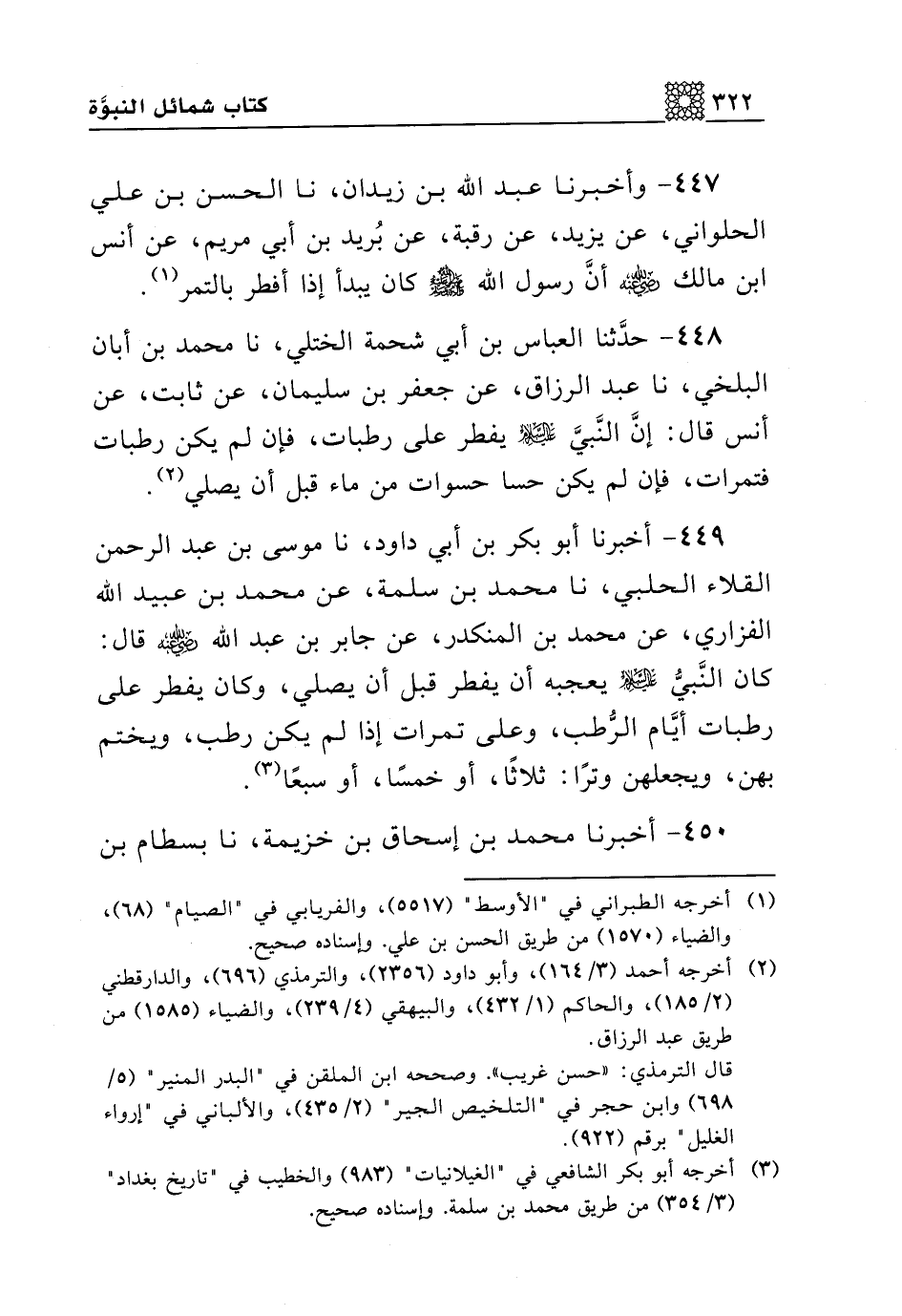 449 - أخبرنا أبو بكر بن أبي داود، نا موسى بن عبد الرحمن القلاء الحلبي، نا محمد بن سلمة، عن محمد بن عبيد الله الفزاري، عن محمد بن المنكدر، عن جابر بن عبد الله رضي الله عنه قال: كان النبي عليه السلام يعجبه أن يفطر قبل أن يصلي، وكان يفطر على رطبات أيام الرطب، وعلى تمرات إذا لم يكن رطب، ويختم بهن، ويجعلهن وترا: ثلاثا، أو خمسا، أو سبعا.