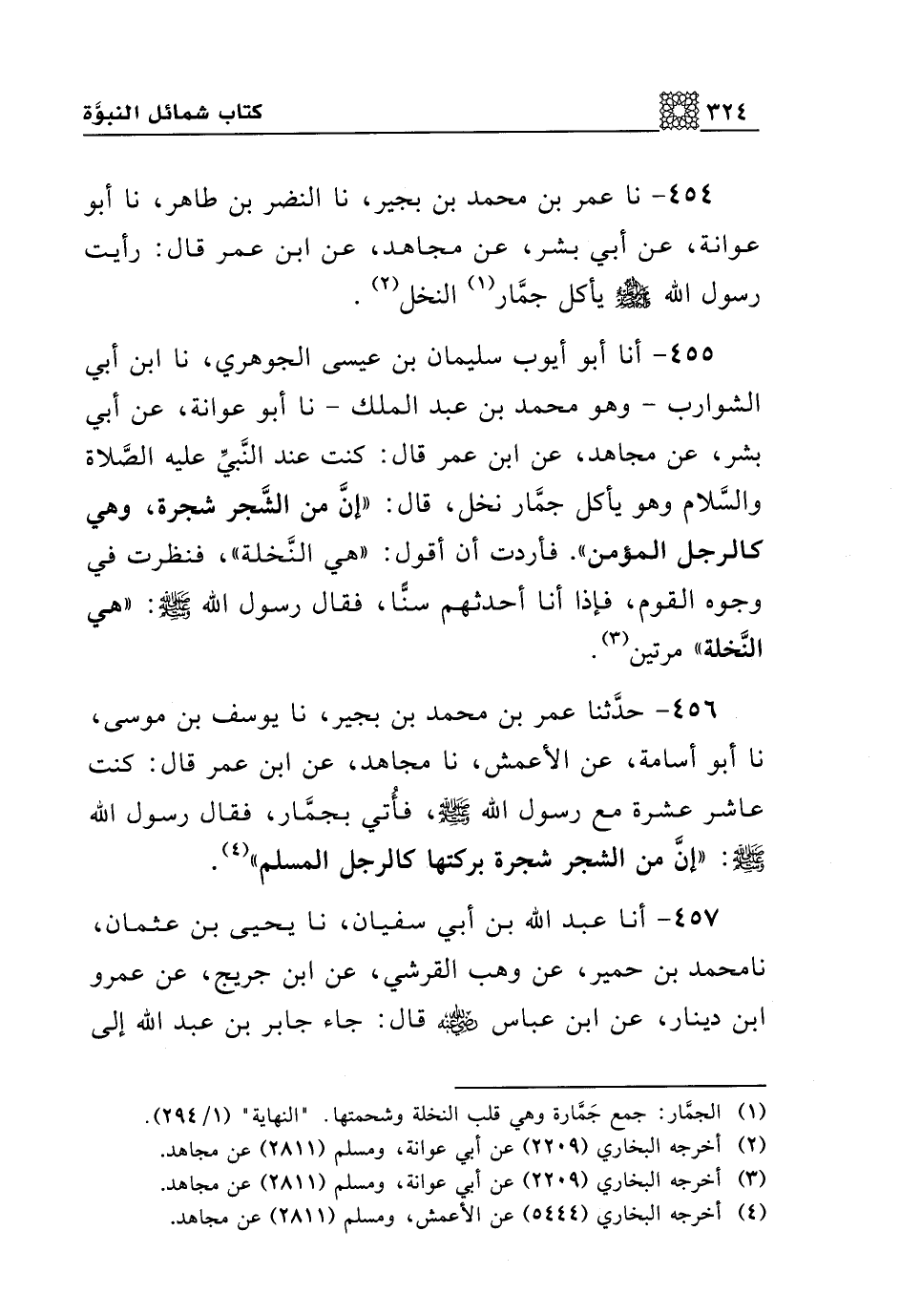 455 - أنا أبو أيوب سليمان بن عيسى الجوهري، نا ابن أبي الشوارب-وهو محمد بن عبد الملك- نا أبو عوانة، عن أبي بشر، عن مجاهد، عن ابن عمر قال: كنت عند النبي عليه الصلاة والسلام وهو يأكل جمار نخل، قال: "إن من الشجر شجرة، وهي كالرجل المؤمن". فأردت أن أقول: "هي النخلة"، فنظرت في وجوه القوم، فإذا أنا أحدثهم سنا، فقال رسول الله صلى الله عليه وسلم: "هي النخلة" مرتين.