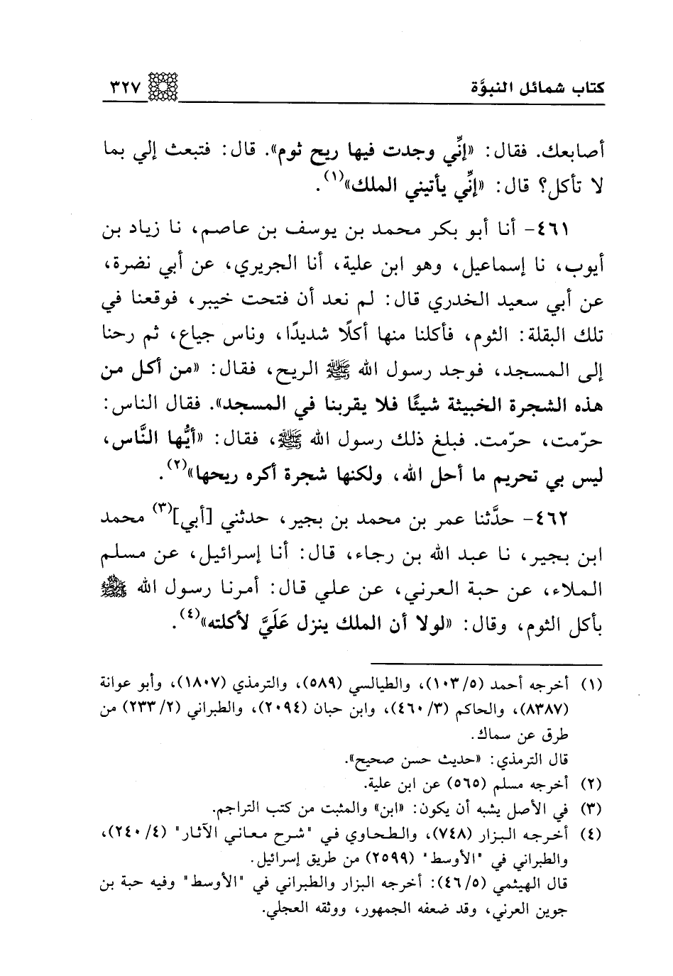 461 - أنا أبو بكر محمد بن يوسف بن عاصم، نا زياد بن أيوب، نا إسماعيل، وهو ابن علية، أنا الجريري، عن أبي نضرة، عن أبي سعيد الخدري قال: لم نعد أن فتحت خيبر، فوقعنا في تلك البقلة: الثوم، فأكلنا منها أكلا شديدا، وناس جياع، ثم رحنا إلى المسجد، فوجد رسول الله صلى الله عليه وسلم الريح، فقال: "من أكل من هذه الشجرة الخبيثة شيئا فلا يقربنا في المسجد". فقال الناس: حرمت، حرمت. فبلغ ذلك رسول الله صلى الله عليه وسلم، فقال: "أيها الناس، ليس بي تحريم ما أحل الله، ولكنها شجرة أكره ريحها".