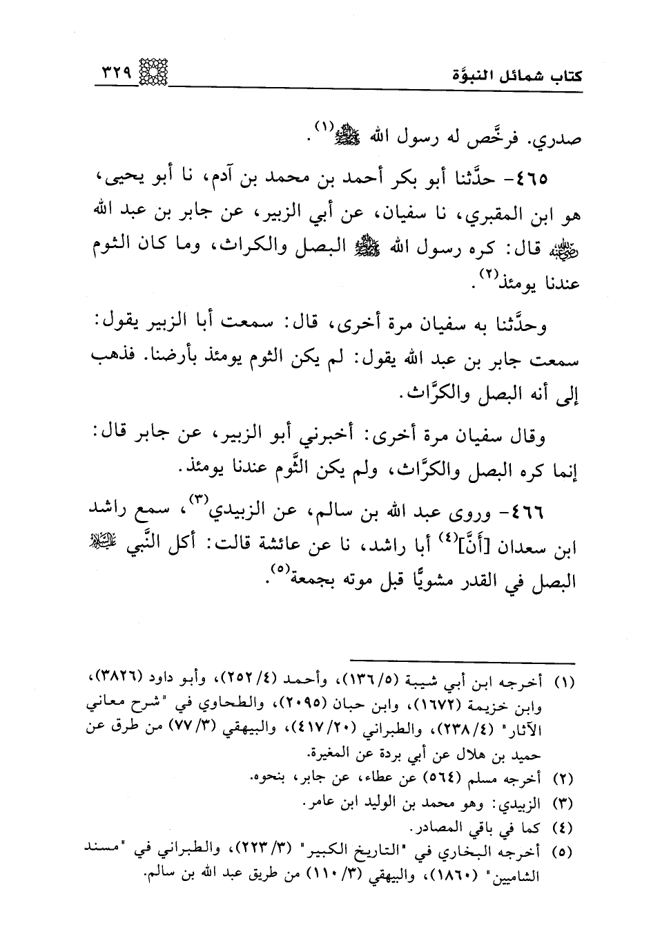 465 - حدثنا أبو بكر أحمد بن محمد بن آدم، نا أبو يحيى، هو ابن المقبري، نا سفيان، عن أبي الزبير، عن جابر بن عبد الله رضي الله عنه قال: كره رسول الله صلى الله عليه وسلم البصل والكراث، وما كان الثوم عندنا يومئذ.