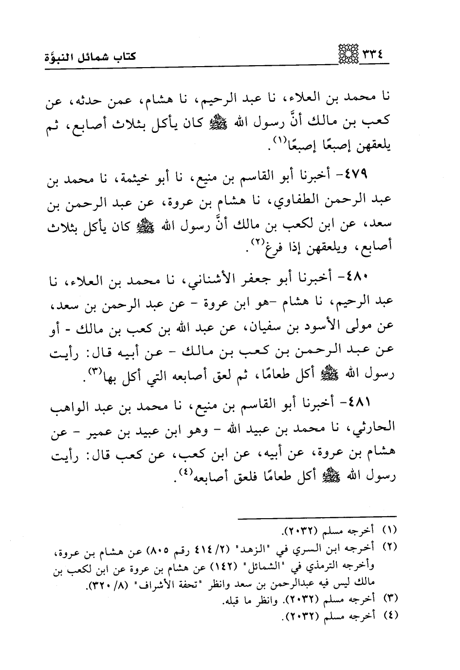 479 - أخبرنا أبو القاسم بن منيع، نا أبو خيثمة، نا محمد بن عبد الرحمن الطفاوي، نا هشام بن عروة، عن عبد الرحمن بن سعد، عن ابن لكعب بن مالك أن رسول الله صلى الله عليه وسلم كان يأكل بثلاث أصابع، ويلعقهن إذا فرغ.