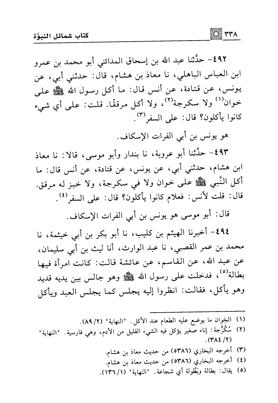 492 - حدثنا عبد الله بن إسحاق المدائني أبو محمد بن عمرو بن العباس الباهلي، نا معاذ بن هشام، قال: حدثني أبي، عن يونس، عن قتادة، عن أنس قال: ما أكل رسول الله صلى الله عليه وسلم على خوان ولا سكرجة، ولا أكل مرققا. قلت: على أي شيء كانوا يأكلون؟ قال: على السفر.