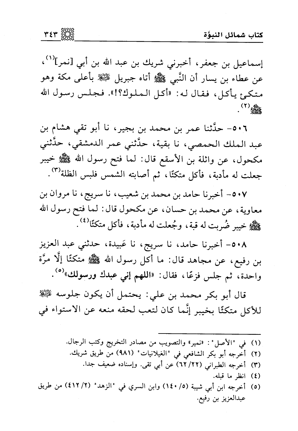 507 - أخبرنا حامد بن محمد بن شعيب، نا سريج، نا مروان بن معاوية، عن محمد بن حسان، عن مكحول قال: لما فتح رسول الله صلى الله عليه وسلم خيبر ضربت له قبة، وجعلت له مأدبة، فأكل متكئا.