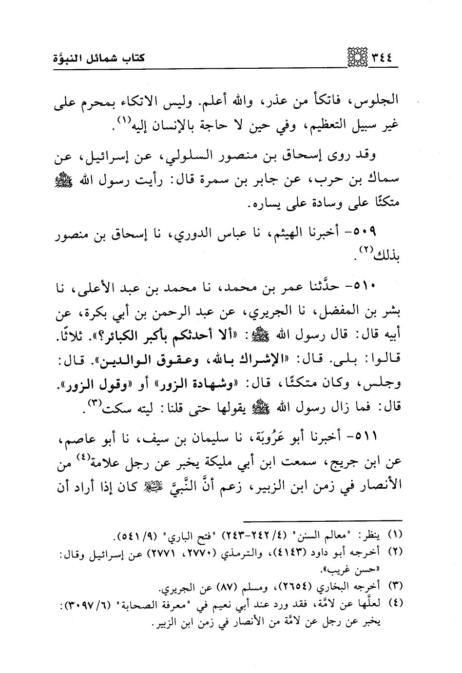 510 - حدثنا عمر بن محمد، نا محمد بن عبد الأعلى، نا بشر بن المفضل، نا الجريري، عن عبد الرحمن بن أبي بكرة، عن أبيه قال: قال رسول الله صلى الله عليه وسلم: "ألا أحدثكم بأكبر الكبائر؟ ". ثلاثا. قالوا: بلى. قال: "الإشراك بالله، وعقوق الوالدين". قال: وجلس، وكان متكئا، قال: "وشهادة الزور" أو" وقول الزور". قال فما زال رسول الله صلى الله عليه وسلم يقولها حتى قلنا: ليته سكت.