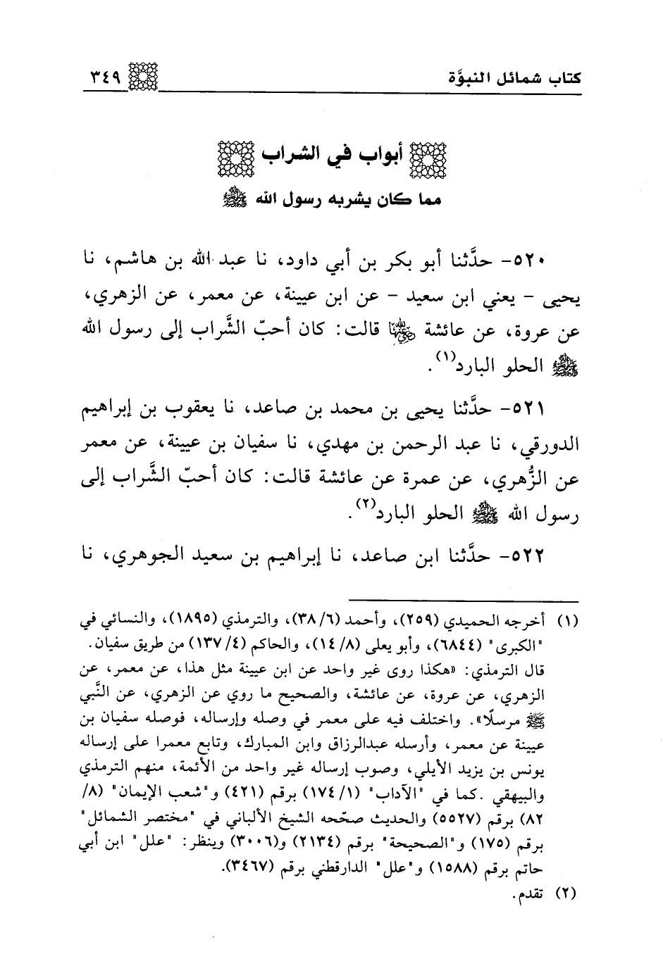 522 - حدثنا ابن صاعد، نا إبراهيم بن سعيد الجوهري، نا سفيان بن عيينة، عن معمر، عن الزهري، عن عروة، عن عائشة قالت: كان أحب الشراب إلى رسول الله صلى الله عليه وسلم الحلو البارد.