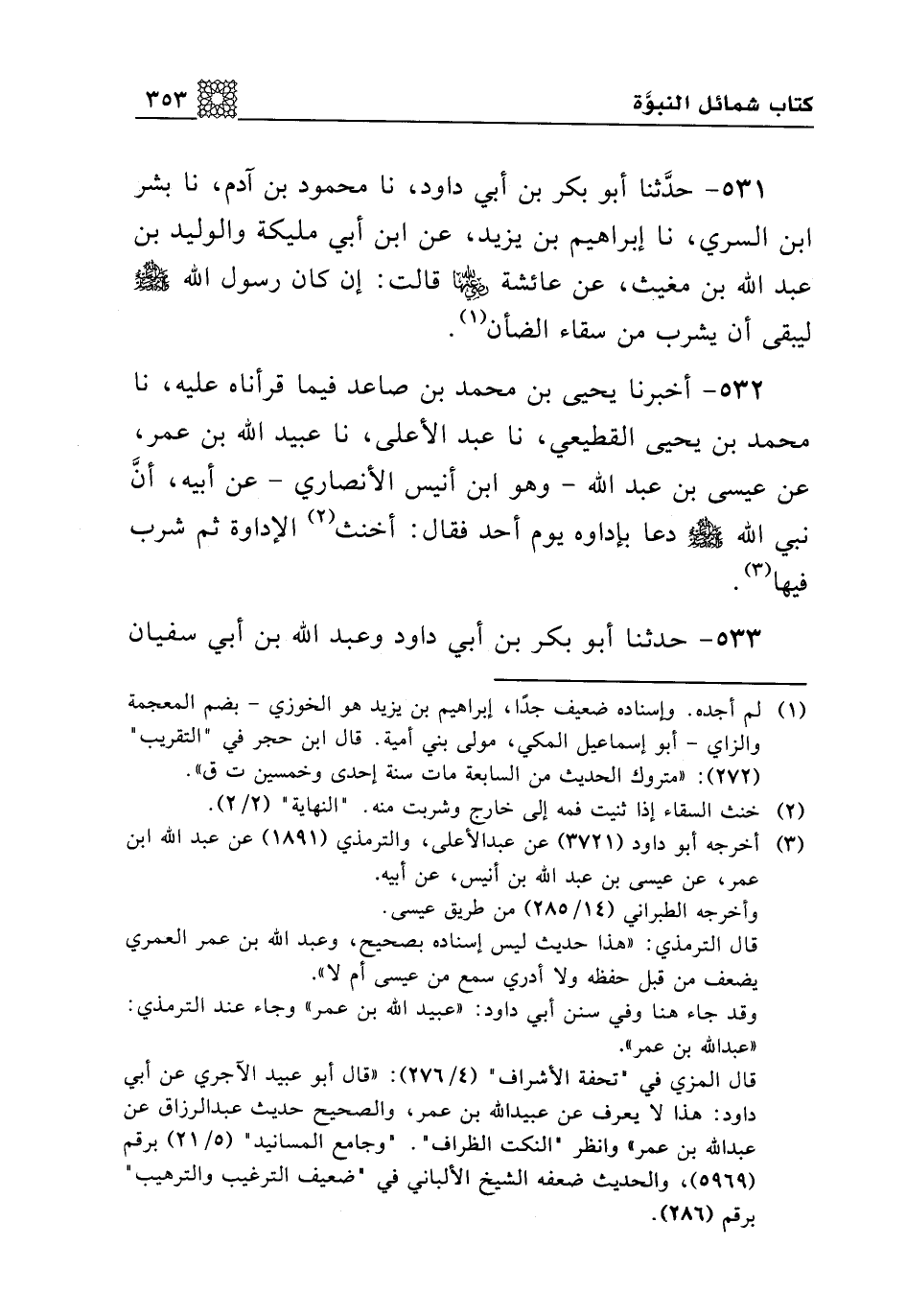 532 - أخبرنا يحيى بن محمد بن الصاعد فيما قرأناه عليه، نا محمد بن يحيى القطيعي، نا عبد الأعلى، نا عبيد الله بن عمر، عن عيس ىبن عبد الله -وهو ابن أنيس الأنصاري- عن أبيه، أن نبي الله صلى الله عليه وسلم دعا بإداوة يوم أحد فقال: أخنث الإداوة ثم شرب فيها.